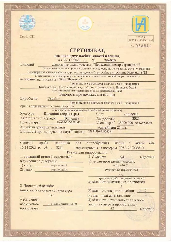 Урожай і якість зерна: За роки вивчення в конкурсному сортовипробуванні показав такі показники з відповідним перевищенням стандарту: урожайність 3,51 т/га (+0,44 т/га), загальна оцінка макаронних властивостей 7,9 бали (+0,9 бали), колір макаронів 8,7 бали (+1,6 бали), маса тисячі зерен 37,8 г (+2,3 г), вміст сирої клейковини 35% (+2 %), сила борошна 249 о. а. (+59 о. а.), натура зерна знаходиться на рівні стандарту.